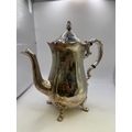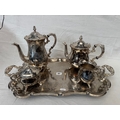 Silver plated drinks’ service comprising twin-handled drinks tray, tea port, coffee pot, twin-handled sugar basin and cream jug (5)