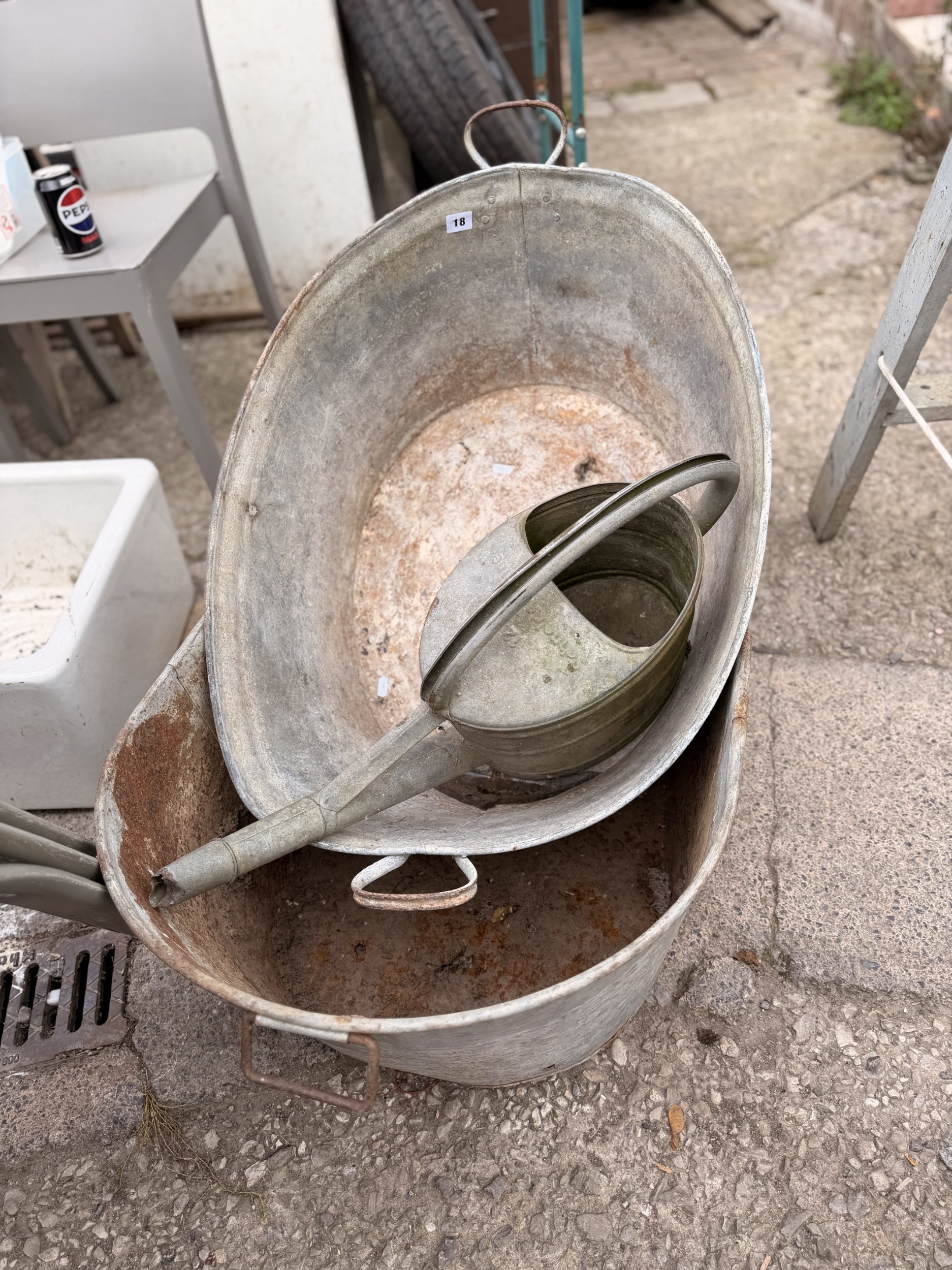 Old weathered galvanised bath tub, dolly pale and water watering can