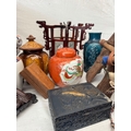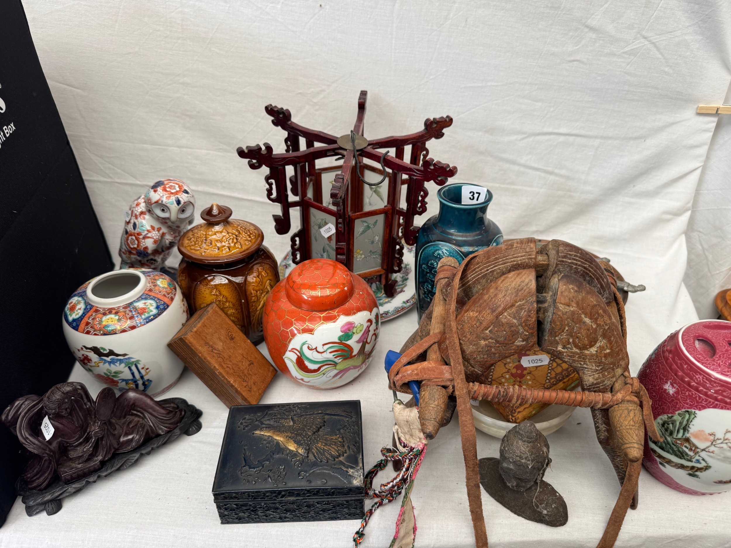 Interesting mixed collection Asian decorative arts to include Chinese porcelain jar and cover with seal mark to underside, carved hardstone recumbent figure on wooden base, hexagonal lantern, carved treen etc
