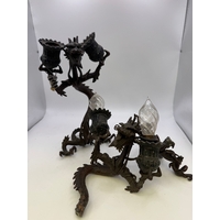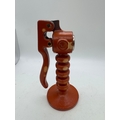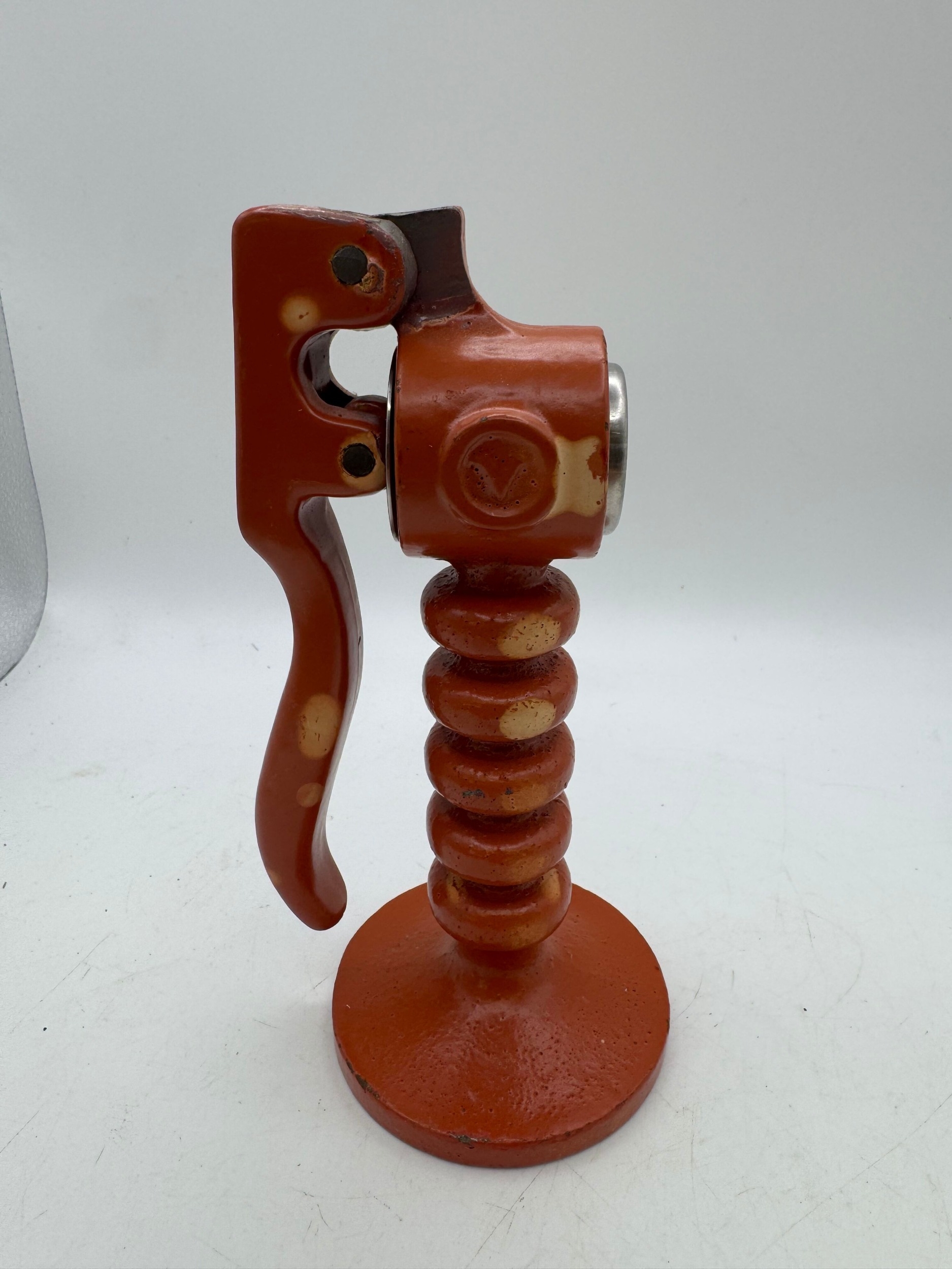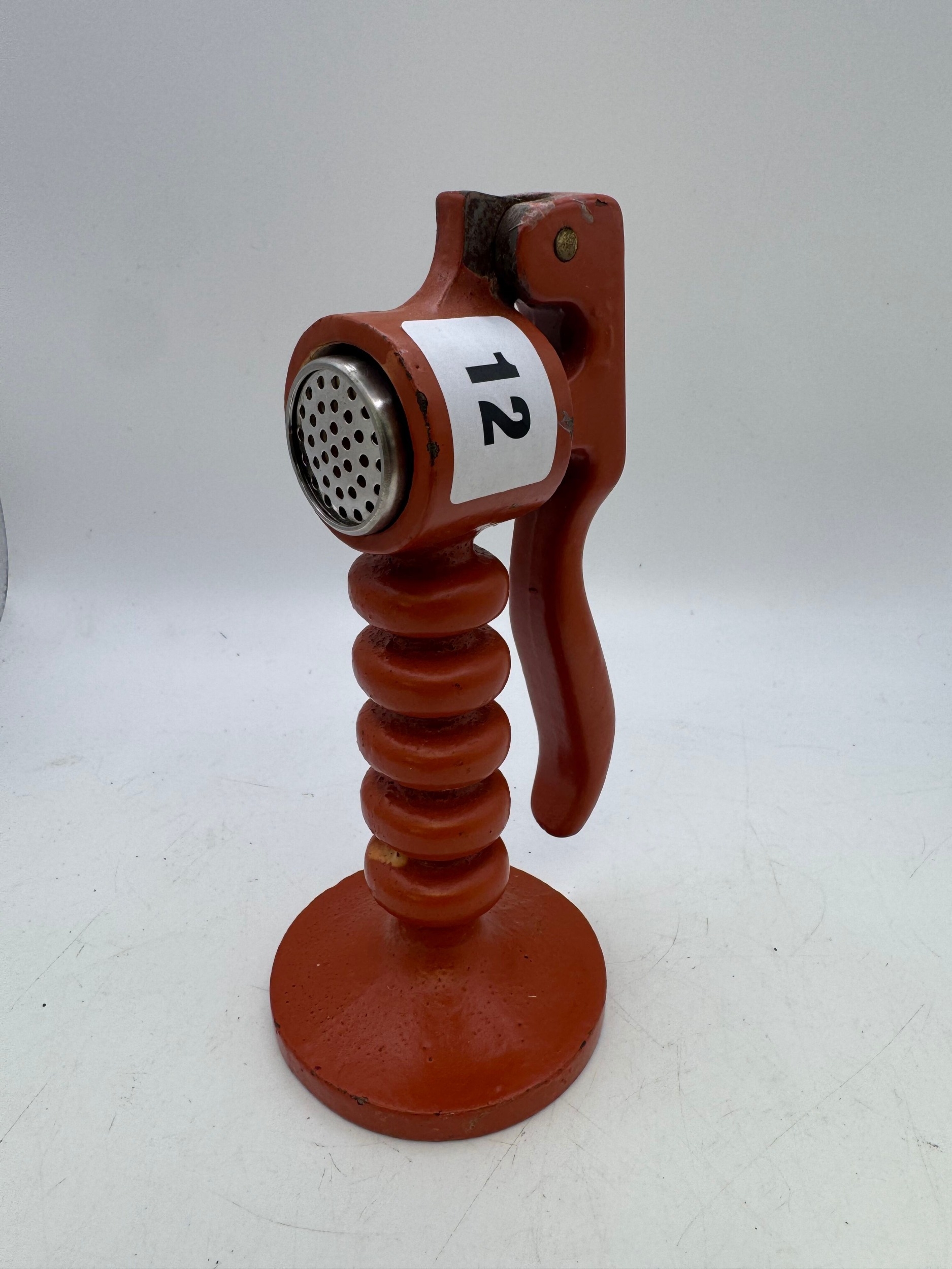 Unusual heavy painted lathe-worked metalwork garlic crusher, 16cm high