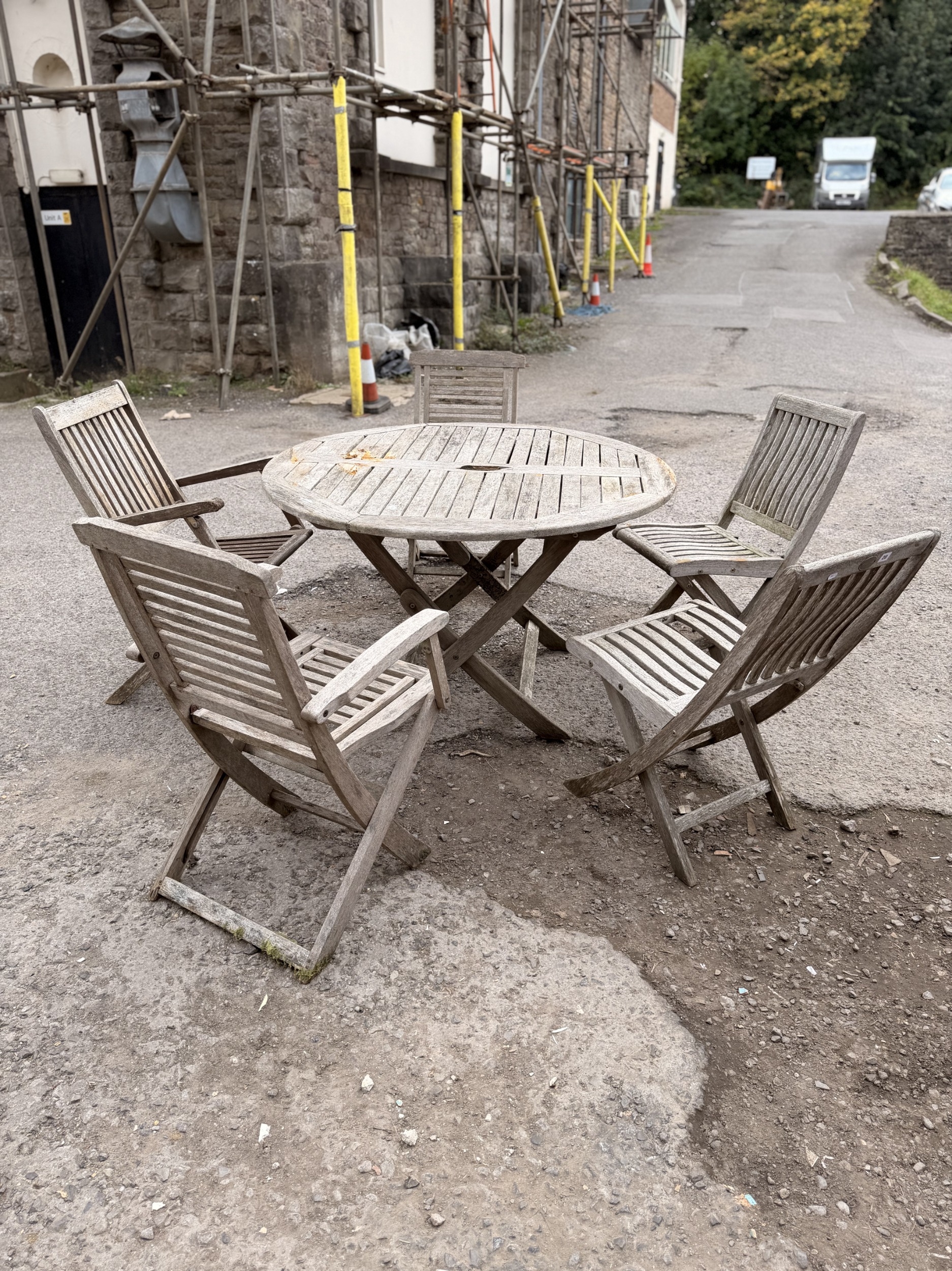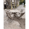 Weathered silvered teak harlequin set of five folding patio/garden chairs, by ‘May Fair’, ‘Royalcraft’ etc together with an associated whethered teak patio table (6)