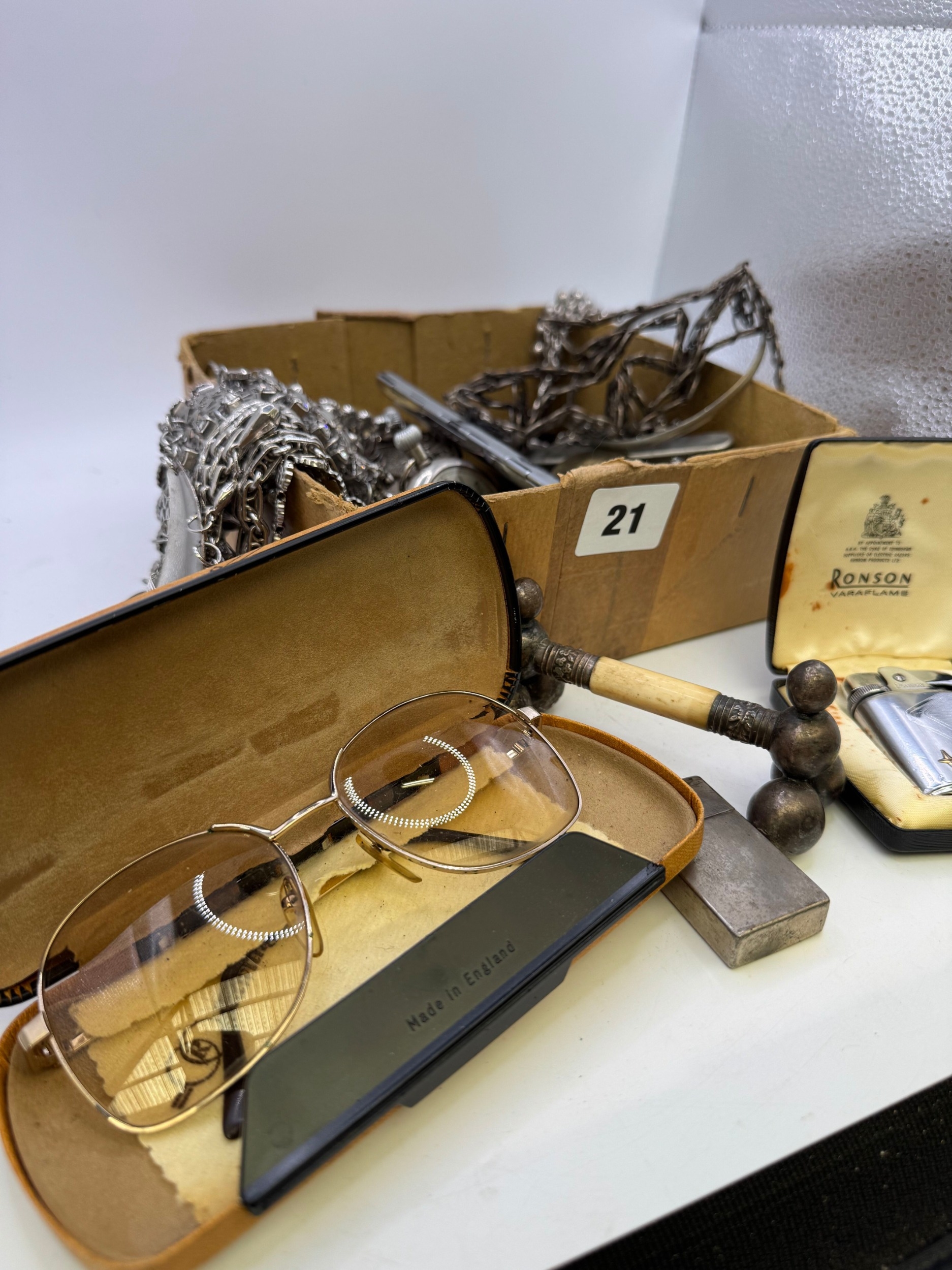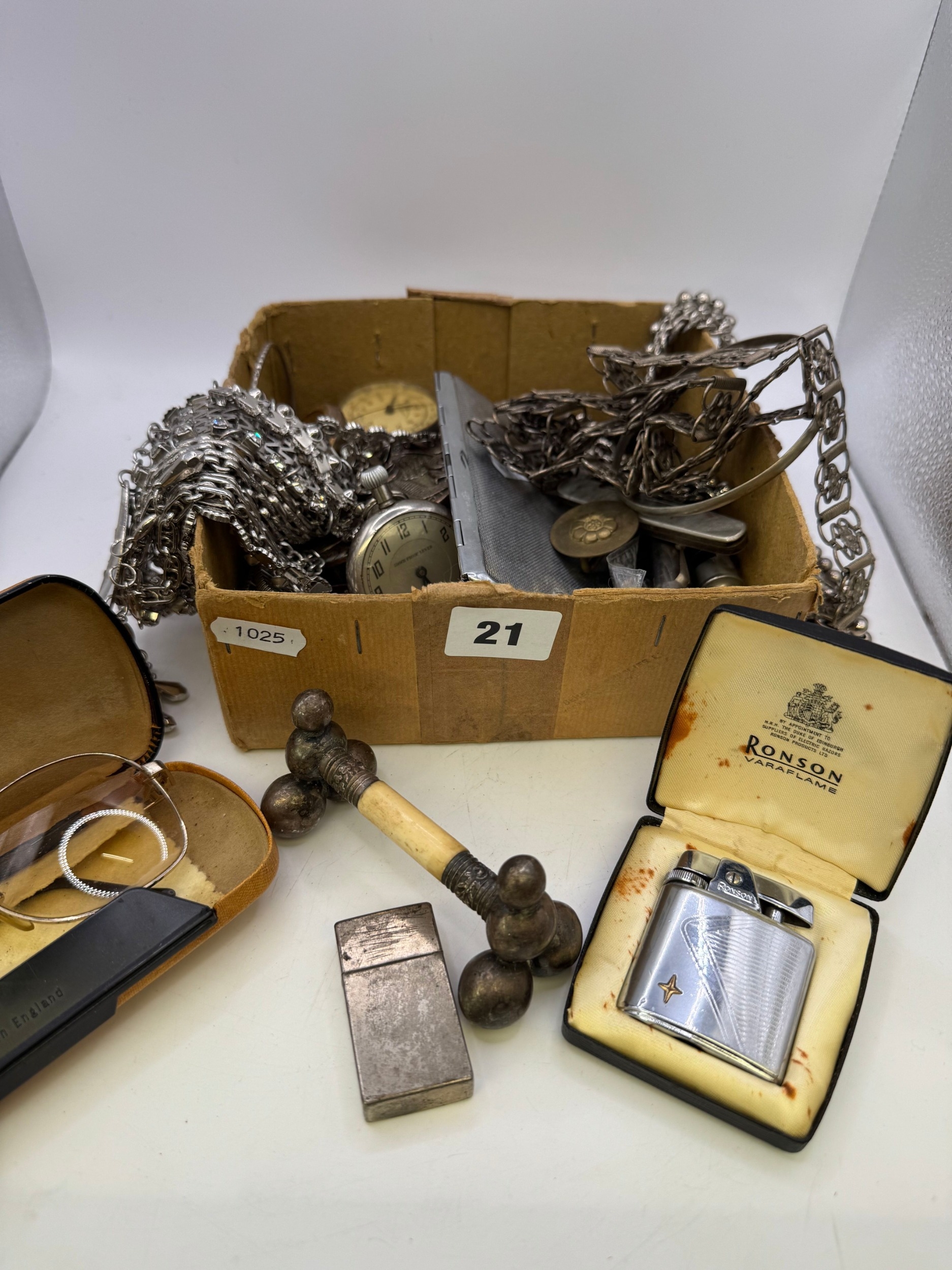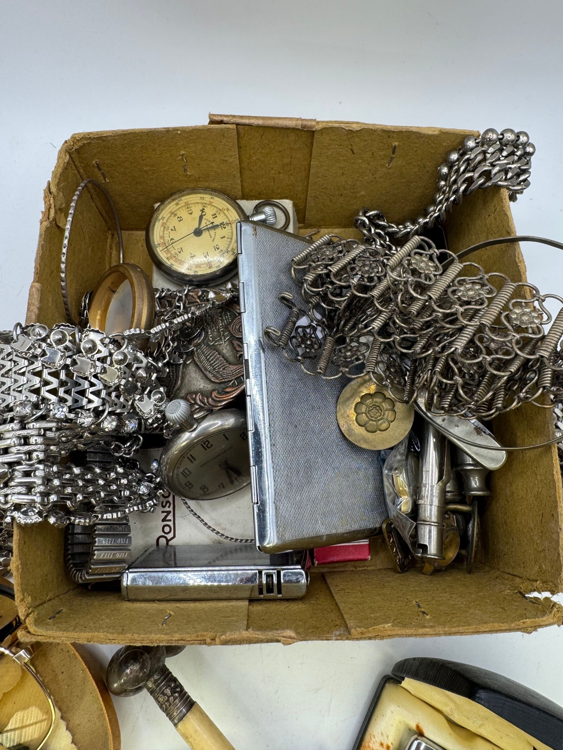Antique and later fob / pocket watches, Ronson and other cigarette lighters, costume and other jewellery, cigarette case, vintage cased Rawlings glasses etc