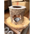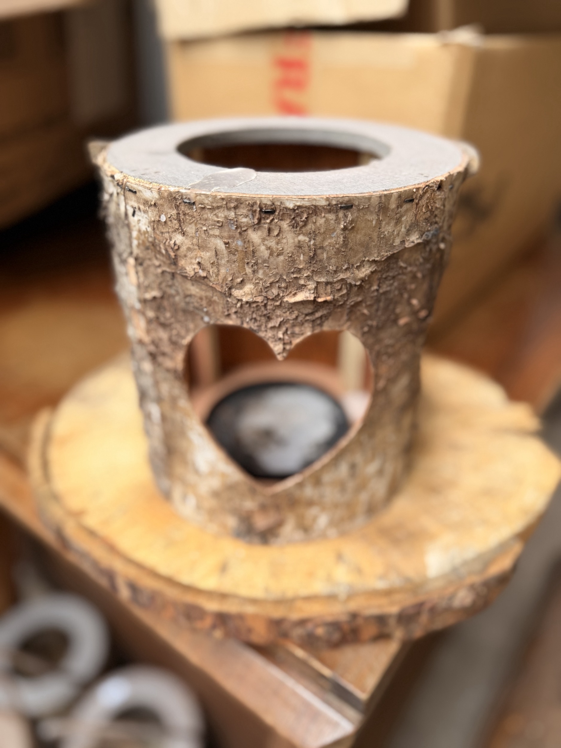 Group of ten decorative ‘tree trunk’ lanterns with loveheart motifs (likely ex-wedding venue) together with a group of rustic cut tree trunk boards