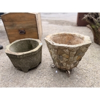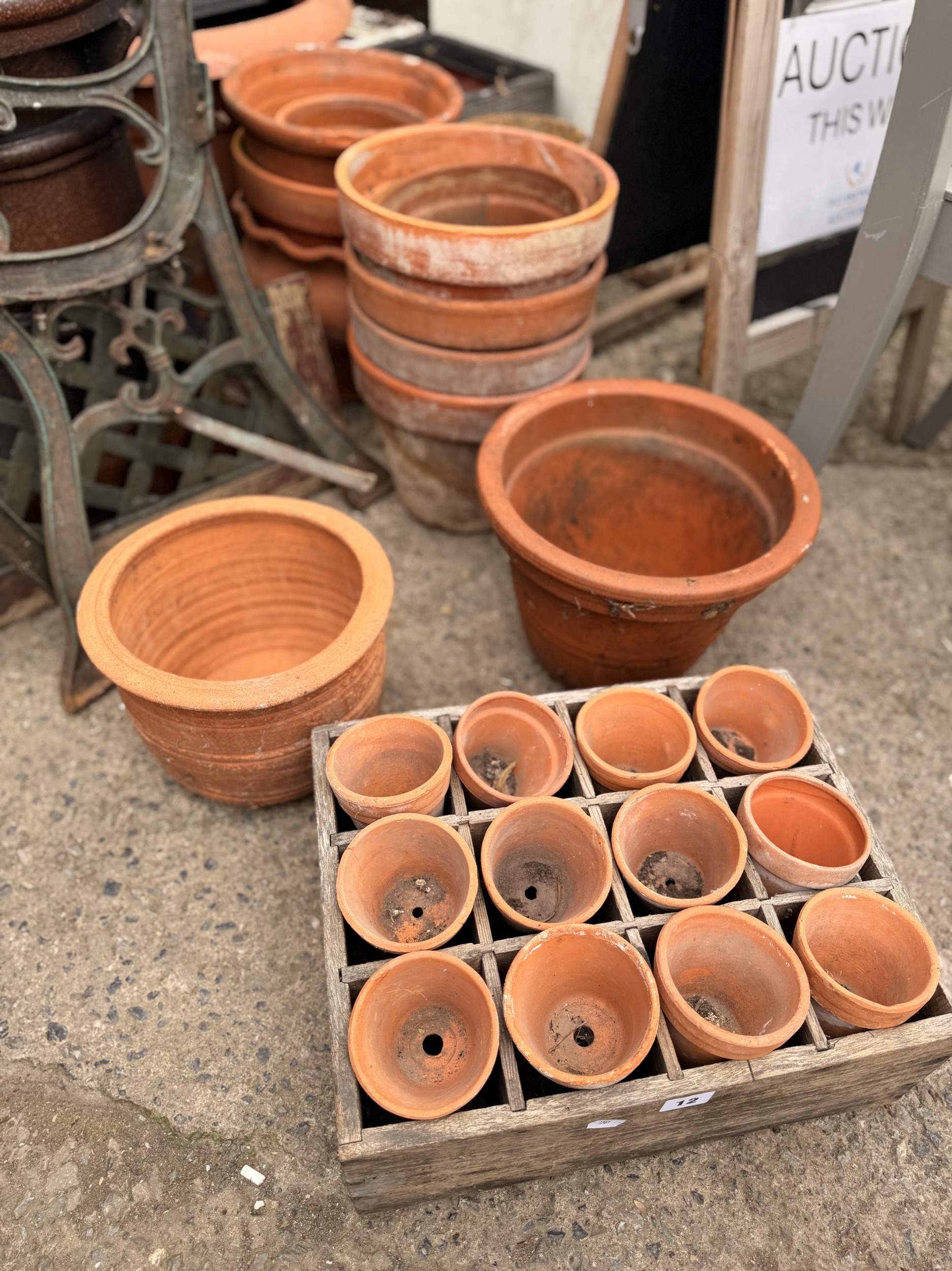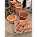 Mixed collection of old weathered terracotta garden pots to include 12 small examples in weathered pine divisional crate