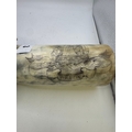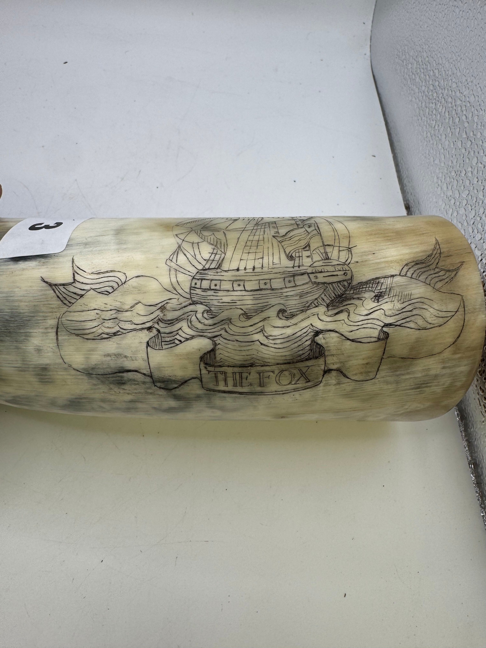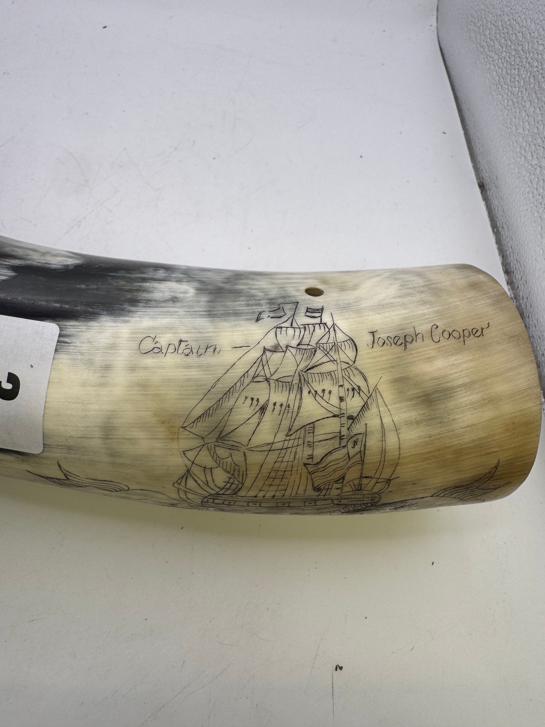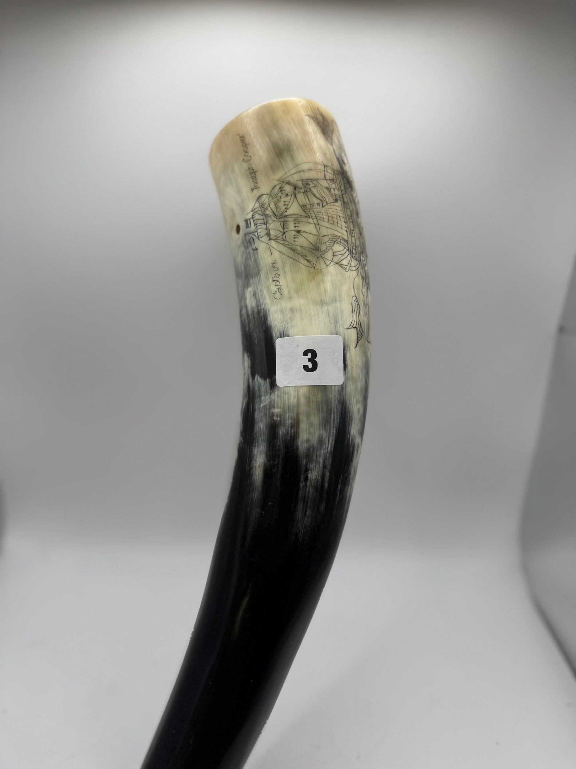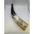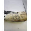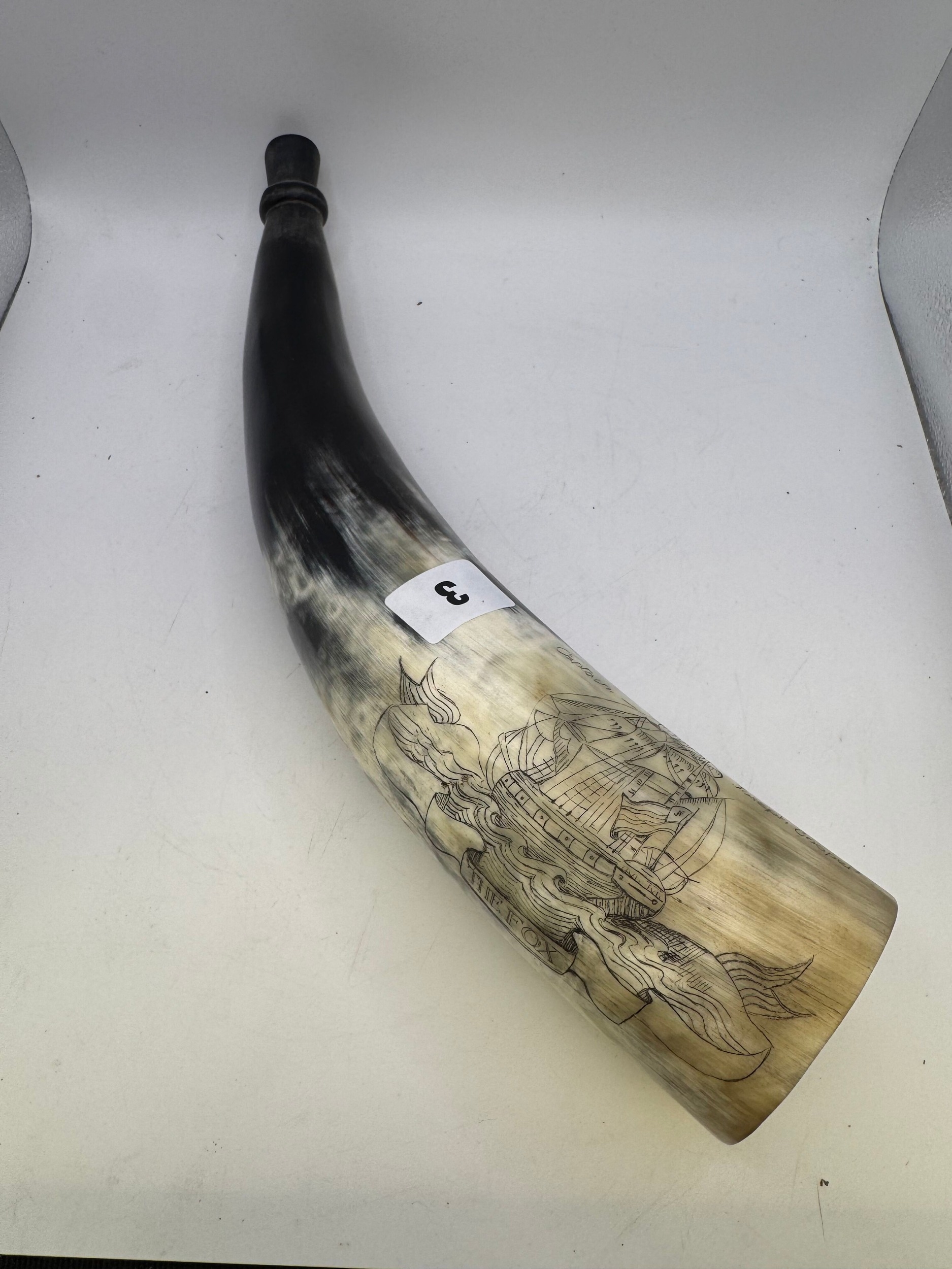 Polished cattle horn powder flask, with scrimshaw type inscription, galleon in full sale above wavy seas ‘The Fox’, ‘Captain Joseph Cooper’, 39cm long