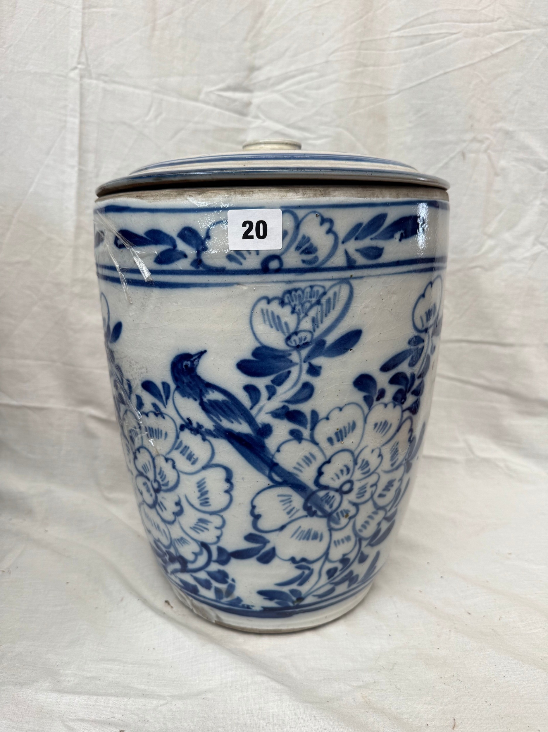 Large old Chinese blue and white lidded jar and cover, 46cm high