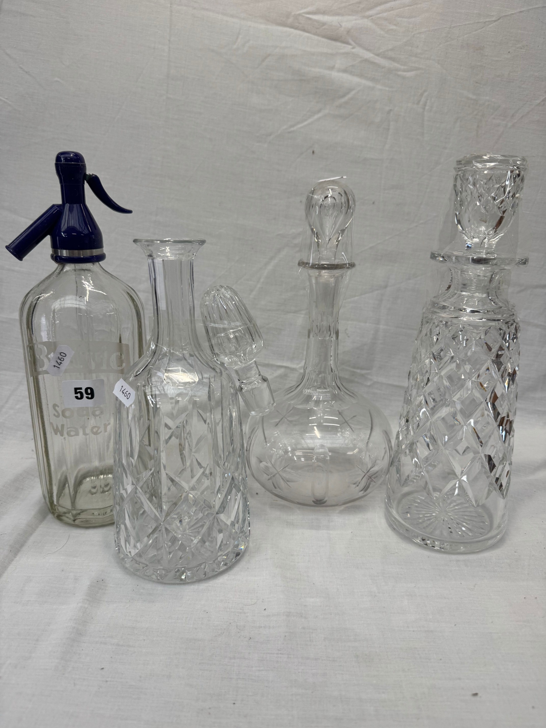 Vintage Britvic soda water syphon and three various clear cut glass decanters