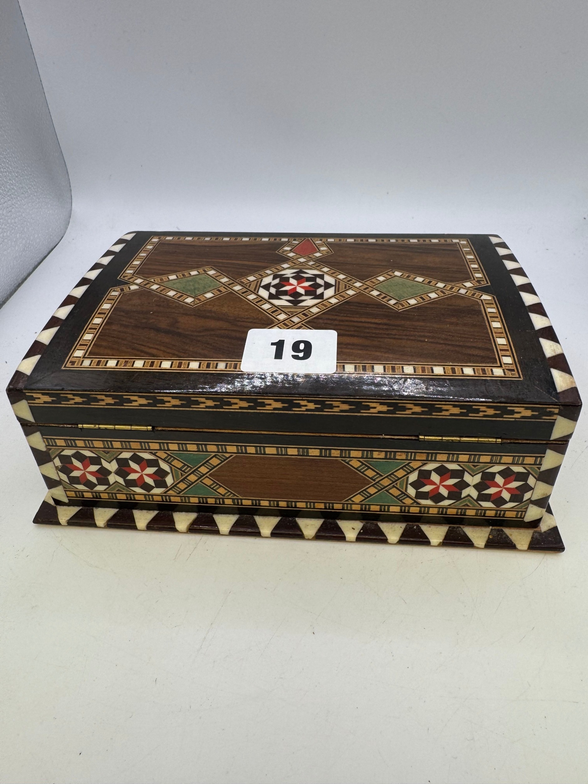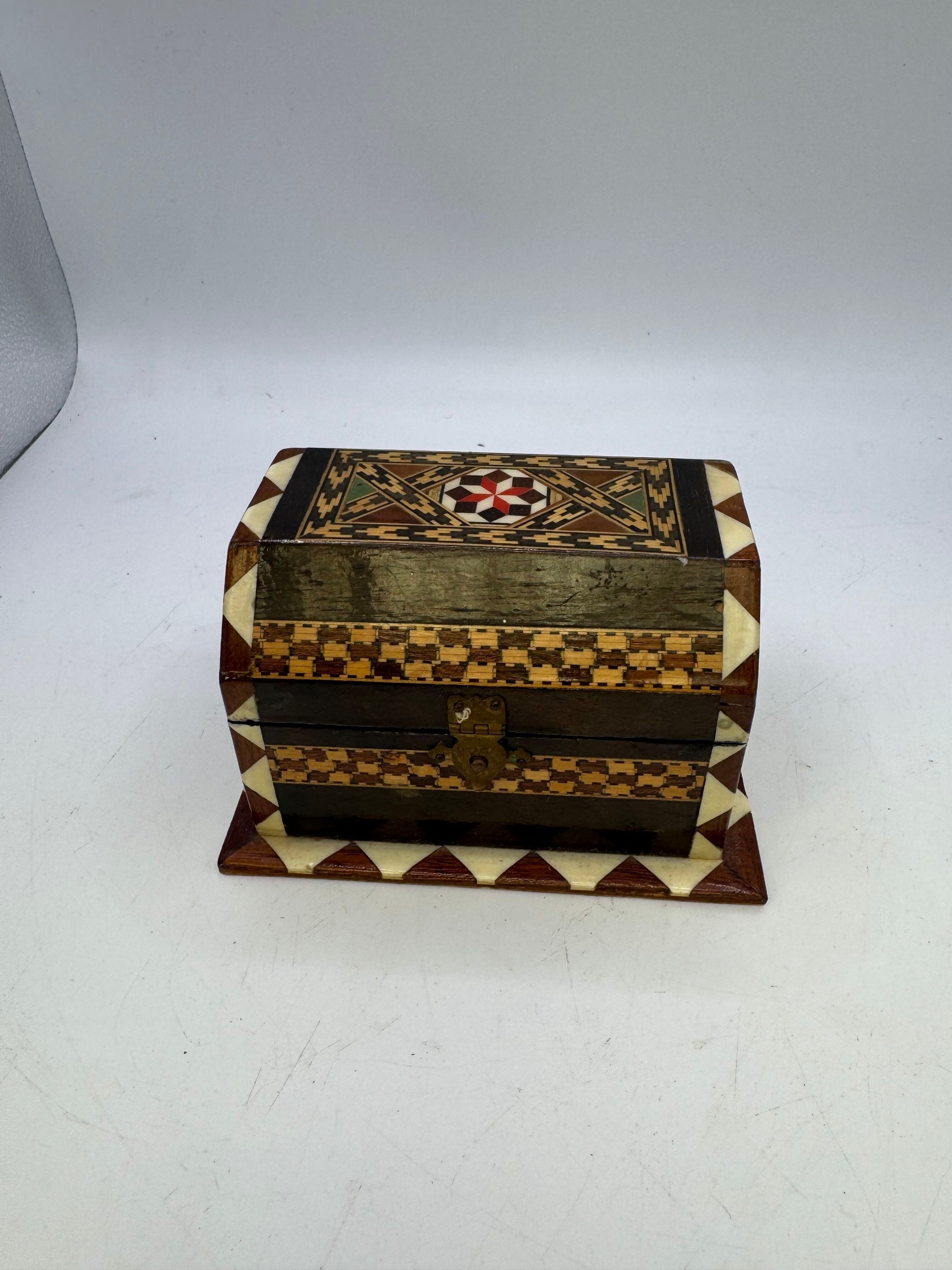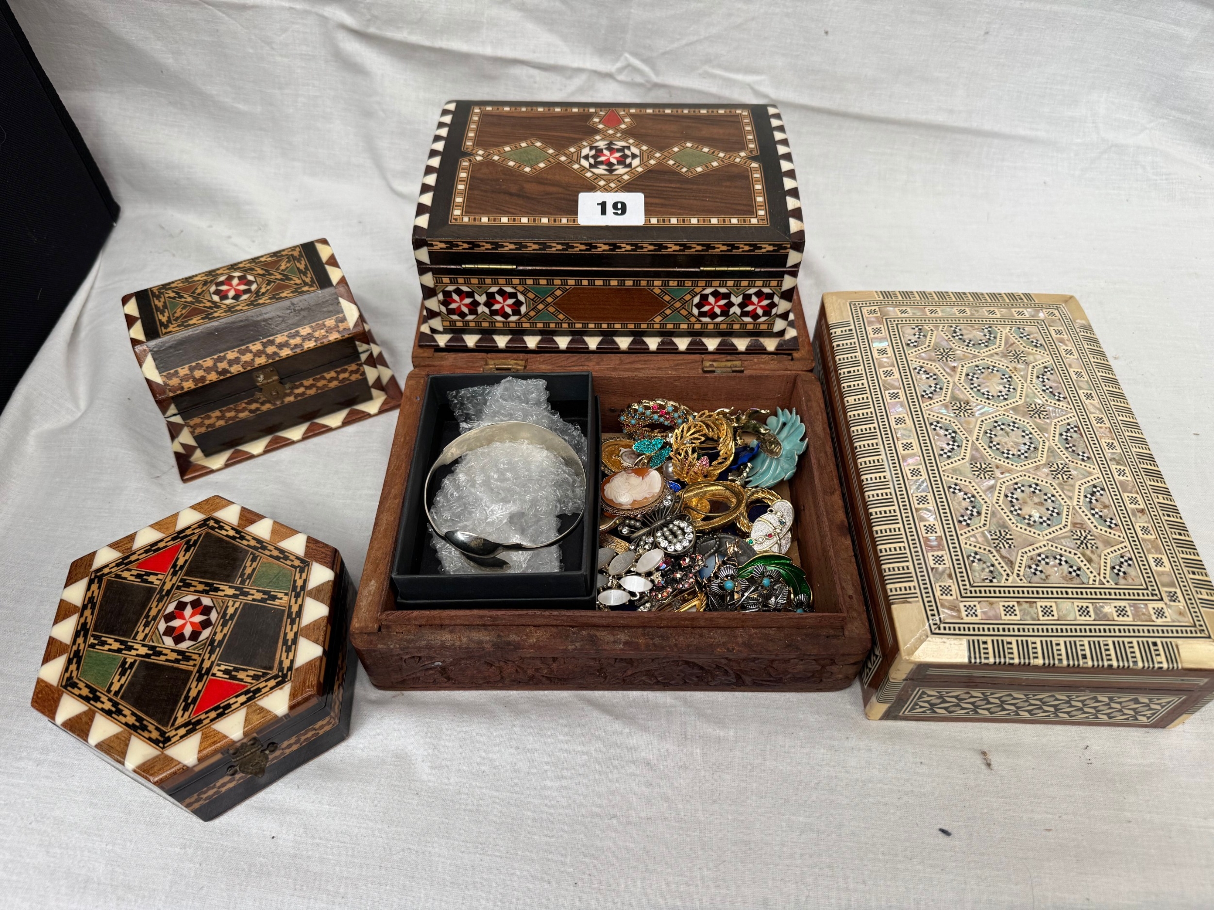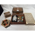 Five various inlaid boxes with bonework and simulated ivory and other parquetry inlaid decoration (5)