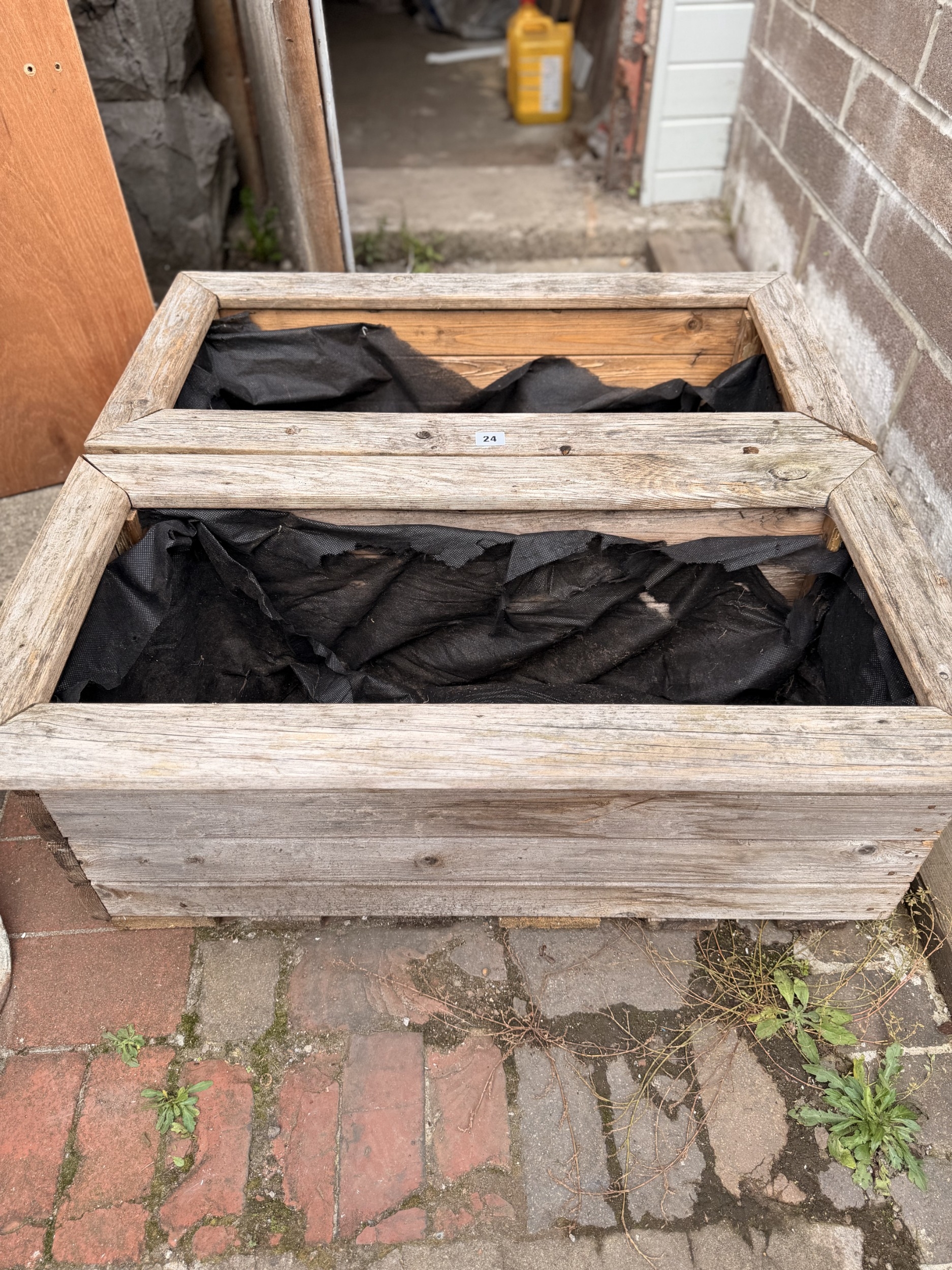Pair of weathered pine box garden planters, each 31 cm high, 82 x 41cm (2)