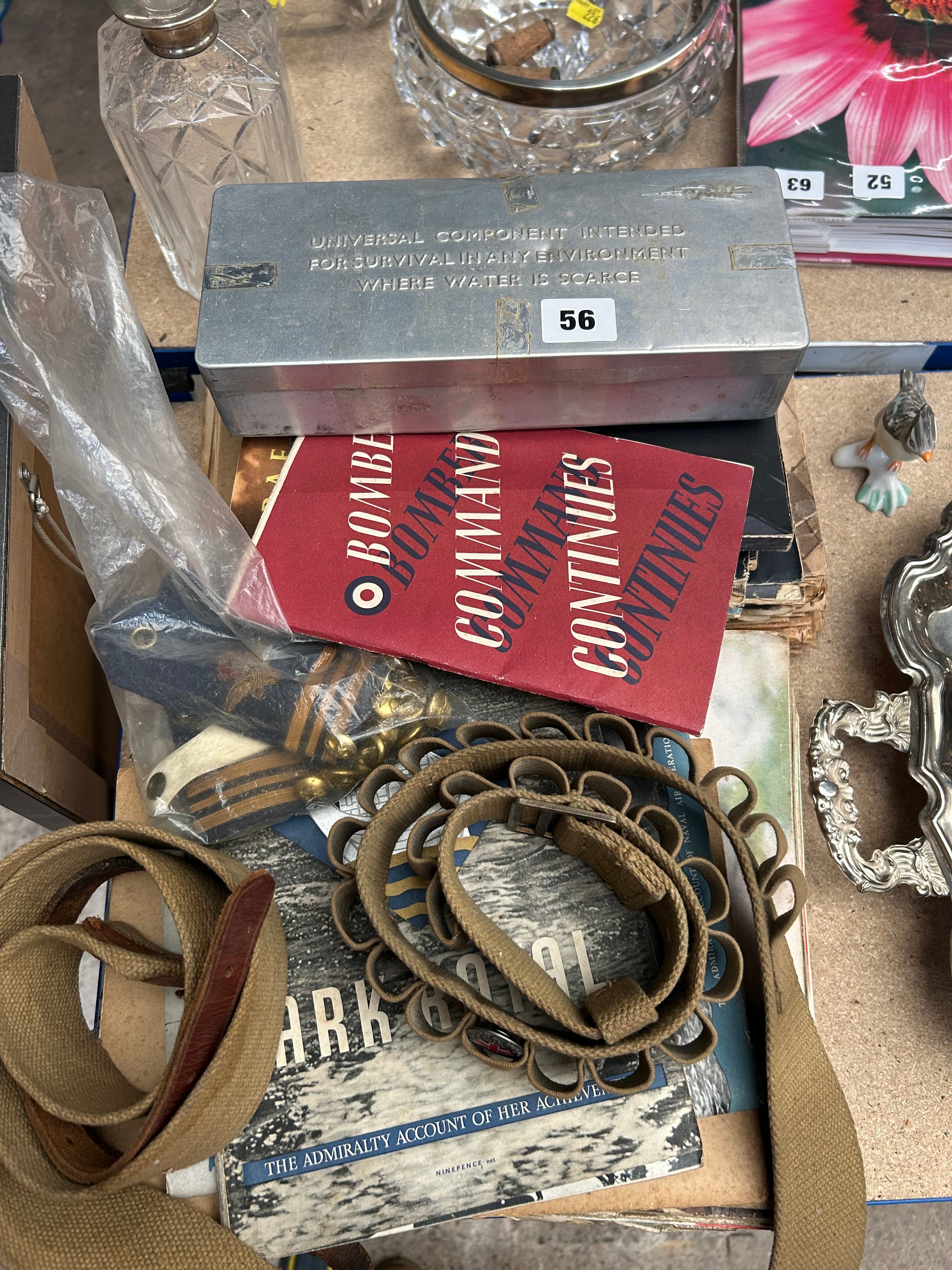 Militaria interest, numerous exampels of ‘Flying Weekly’, books on bomber command etc, RAF emergency ration box, munition belt etc