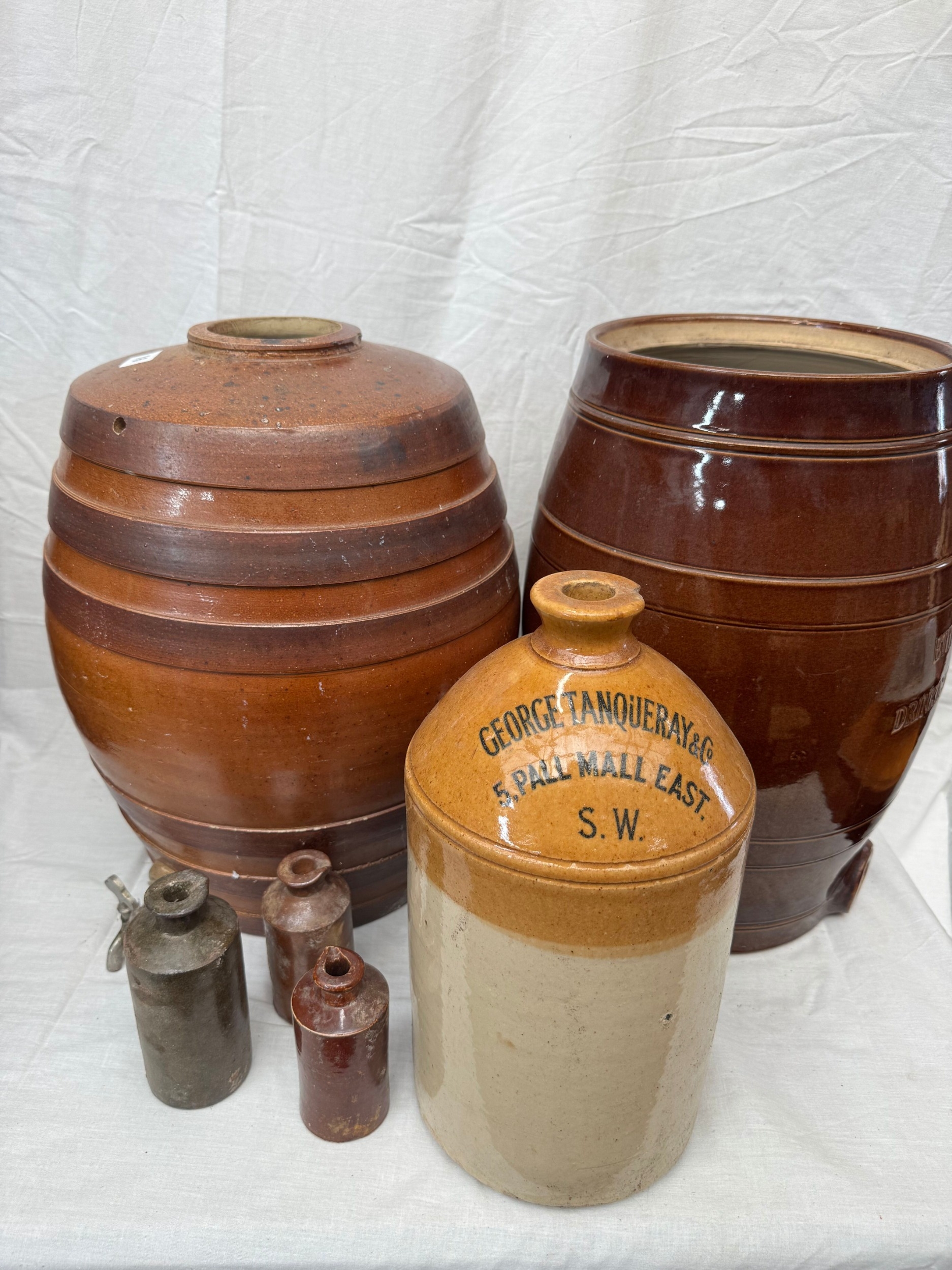 Group of antique salt glazed jars to include a large banded spirit flask with tap, a gin jar marked ‘George Tanquery & Co, etc